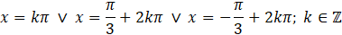 Rozwiąż równanie. W tym celu znajdź jego przykładowe rozwiązania, a następnie korzystając z okresowości funkcji sinus i cosinus, wyznacz wyniki w zbiorze liczb rzeczywistych.