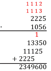 W pierwszym kroku musisz obliczyć iloczyn liczby, zapisanej nad drugą liczbą, z liczbą jedności liczby poniżej. Zapisz wynik pod kreską. Następnie pomnóż liczbę zapisaną nad druga liczbą, przez liczbę dziesiątek i wynik zapisz pod poprzednim wynikiem, jednak tak, aby liczba jedności drugiego wyniku pokrywała się z liczbą dziesiątek drugiego. Powtórz te czynności odpowiednią ilość razy, a na końcu wykonaj dodawanie, którego wynik będzie wynikiem mnożenia. Wynik z mnożenia 2225 × 0 możesz pominąć, ponieważ jest on równy 0, czyli nie zmieni wyniku.