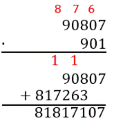 W pierwszym kroku musisz obliczyć iloczyn liczby, zapisanej nad drugą liczbą, z liczbą jedności liczby poniżej. Zapisz wynik pod kreską. Następnie pomnóż liczbę zapisaną nad druga liczbą, przez liczbę dziesiątek i wynik zapisz pod poprzednim wynikiem, jednak tak, aby liczba jedności drugiego wyniku pokrywała się z liczbą dziesiątek drugiego. Powtórz te czynności odpowiednią ilość razy, a na końcu wykonaj dodawanie, którego wynik będzie wynikiem mnożenia. Wynik z mnożenia 90807 × 0 możesz pominąć, ponieważ jest on równy 0, czyli nie zmieni wyniku.