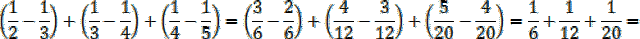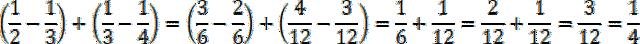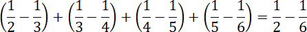 Oblicz wartość po lewej stronie znaku równości, możesz sprowadzać poszczególne ułamki do wspólnych mianowników, a na koniec dodać je. Oblicz różnicę po prawej stronie znaku równości i porównaj wyniki – są takie same. Zauważ, w każdym nawiasie występuje odejmowanie ułamków o licznikach 1 i mianownikach różniących się o jeden (liczba w mianowniku odjemnika jest większa, czyli odjemnik jest mniejszy). Odjemna w kolejnym nawiasie jest taka sama, co poprzedni odjemnik, więc ułamek, który odjęliśmy zaraz potem dodajemy, czyli wynik wraca do wartości początkowej. Swojej „pary” nie ma pierwszy i ostatni ułamek, a więc jedynie one mają wpływ na wynik.