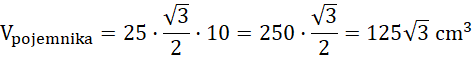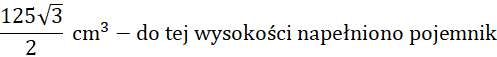 . Z tablicy wartości funkcji trygonometrycznych dla kątów ostrych odczytaj wartość sinusa dla 60°. Podstawiasz dane do wzoru i obliczasz, ile wynosi pole. Następnie do wzoru na objętość podstawiasz wartość pola i wysokość bryły, wykonujesz obliczenia. Pojemnik napełniono wodą do połowy jego wysokości, a więc dzielisz całą objętość na połowę, aby dowiedzieć się, jaka jest objętość nalanej wody.