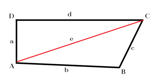 Trójkąty ACD i ABC mają wspólną krawędź e, dlatego po dodaniu ich obwodów oraz odjęciu obwodu czworokąta ABCD otrzymamy