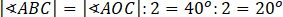 Kąt AOC jest kątem środowym opartym na tym samym łuku, co kąt wpisany ABC. Więc jego miara jest dwa razy większa. Na tej podstawie oblicz miarę kąta ABC.
