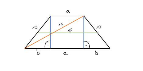 W tym zadaniu musisz obliczyć długości podstaw trapezu, wiedząc, że ramiona mają długość 10 cm, obie przekątne mają po 17 cm, a odcinek łączący środki ramion ma długość 15 cm.