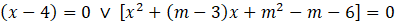 Zauważ, że aby równanie miało trzy różne rozwiązania, to miejscem zerowym drugiego nawiasu nie może być 4. Wyklucz