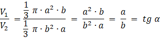 W tym zadaniu musisz wykazać, że V1 :V2 = tg α, jeśli w trójkącie prostokątnym kąt między krótszą przyprostokątną i przeciwprostokątną ma miarę α i trójkąt obrócono najpierw wokół krótszej przyprostokątnej, następnie wokół dłuższej przyprostokątnej i otrzymano stożki o objętości V1 i V2.