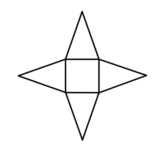 Rysunek zacznij od podstawy ostrosłupa – kwadratu o bokach długości 4 cm. Następnie na każdej krawędzi podstawy dorysuj ścianę boczną — trójkąt równoramienny o podstawie 2 cm i wysokości 6 cm. Najłatwiej będzie, jeśli z połowy każdej podstawy narysujesz prostopadle wysokość o długości 6 cm, a następnie połączysz tak powstały wierzchołek trójkąta z podstawą.