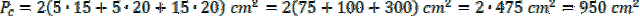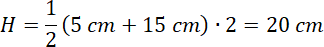 Jedna z krawędzi podstawy ma długość 5 cm, a druga krawędź jest trzy razy dłuższa. Ma 15 cm. Wysokość bryły jest równa połowie sumy długości wszystkich krawędzi podstawy. Oblicz wysokość: