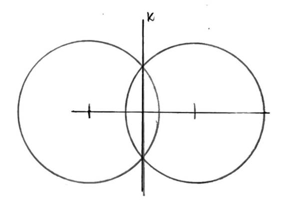 Narysuj okrąg o dowolnym promieniu oraz prostą mającą dwa punkty wspólne z okręgiem. Następnie narysuj prostą prostopadłą do prostej k przechodzącą przez środek narysowanego okręgu. Odłóż na tej prostej odległość środka okręgu. Następnie wykreśl okrąg o środku w punkcie symetrycznym, o takim samym promieniu jak pierwszy okrąg.