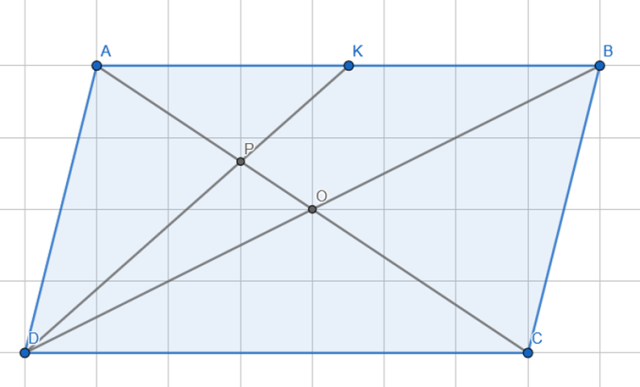 przekątne równoległoboku ABCD przecinają się w punkcie O. Punkt K jest środkiem boku AB i odcinek DK przecina się z przekątną AC w punkcie P.
