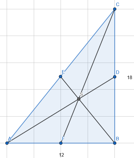 Trójkąty BCF i ABD są prostokątne więc wykorzystaj twierdzenie Pitagorasa do obliczenia boków. Środkowa wychodząca z wierzchołka z kątem prostym jest równa połowie długości przeciwprostokątnej.