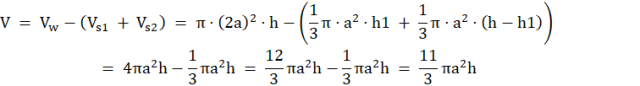 Zauważ, że objętość bryły jest równa różnicy objętości walca o promieniu podstawy 2a i wysokości h oraz dwóch stożków: jeden o promieniu podstawy a i wysokości h1, a drugi o promieniu podstawy a i wysokości h-h1
