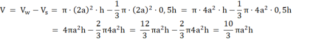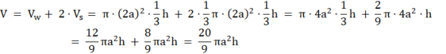 Zauważ, że objętość bryły jest równa różnicy objętości walca o promieniu podstawy 2a i wysokości h oraz stożka o promieniu podstawy 2a i wysokości ½ h