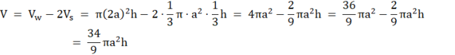 Zauważ, że objętość bryły jest równa różnicy objętości walca o promieniu podstawy 2a i wysokości h oraz dwóch stożków o promieniu podstawy a i wysokości i