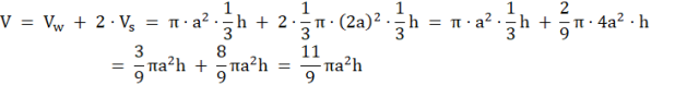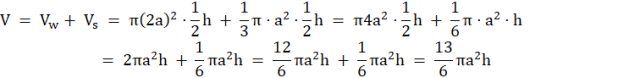 Zauważ, że objętość bryły jest równa sumie objętości walca o promieniu podstawy 2a i wysokości ½ h oraz stożka o promieniu podstawy a i wysokości ½ h