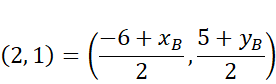 Wyznacz punkt B, wiedząc, że punkt S = (2, 1) jest środkiem odcinka o końcach w punktach A = (-6, 5) i B.