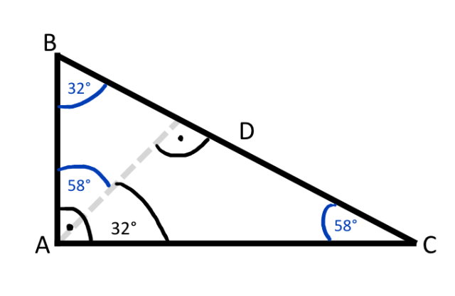 Z wierzchołka kąta prostego w trójkącie prostokątnym ABC została poprowadzona wysokość AD. Miara kąta DAC to 32°. Oblicz miary kątów w trójkącie ABC.