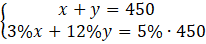 Na początku musisz oznaczyć symbolami masy obu roztworów. Następnie musisz zapisać pierwsze równanie, w którym suma mas obu roztworów wynosi 450. Drugim równaniem będzie to, że suma ilości cukru w poszczególnych roztworach jest równa ilości cukru w 450 g 5-procentowego roztworu.