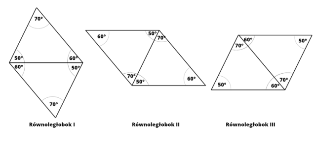 Najpierw wykonaj rysunek pomocniczy. Zauważ, że z podanych trójkątów można ułożyć równoległobok na trzy różne sposoby. Zwróć uwagę, że równoległobok ma dwie pary kątów o takiej samej mierze.