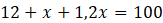 Przyjmij oznaczenia jak na rysunku. Wylicz x wiedząc, że suma 12 + x+ 1,2x wynosi 100.