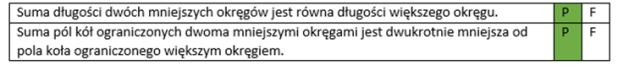 | Suma pól kół ograniczonych dwoma mniejszymi okręgami jest dwukrotnie mniejsza od pola koła ograniczonego większym okręgiem. | P | F |