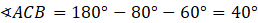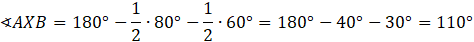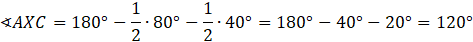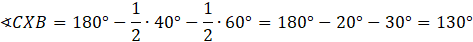 Zacznij od obliczenia miary kąta ACB korzystając z sumy kątów w trójkącie. Proste AX, BX i CX dzielą kąty na połowy, ponieważ są dwusiecznymi kątów.