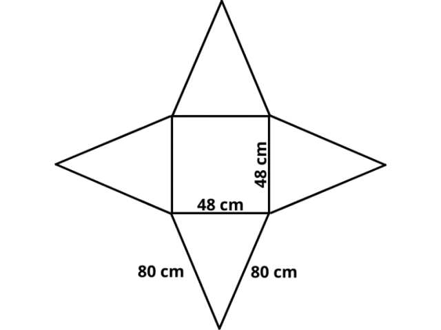 Mając informację, iż krawędź podstawy ostrosłupa prawidłowego czworokątnego ma długość 12 cm, a krawędź boczna 20 cm, narysuj siatkę tego ostrosłupa w skali 1 : 4.