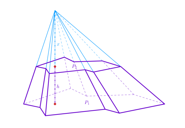 Dopełnij ostrosłup ścięty do pełnego ostrosłupa. Ostrosłup o podstawie z figury o polu 𝑃₂ jest podobny do ostrosłupa o podstawie z figury o polu 𝑃₁ . Skalę podobieństwa między tymi bryłami można zapisać na następujące sposoby: