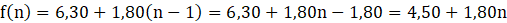 W tym zadaniu musisz wyznaczyć wzór funkcji f opisującej wysokość opłaty za przejazd w zależności od liczby n przejechanych kilometrów, wiedząc, że za pierwszy kilometr klient musi zapłacić 6 zł 30 gr, a za każdy następny opłata wynosi 1 zł 80 gr.