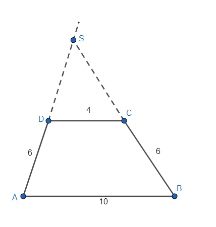 W trapezie równoramiennym, gdzie długości podstaw to |AB| = 10 i |CD| = 4, a długości ramion to |BC| = |AD| = 6, ramiona trapezu przedłużono do przecięcia w punkcie S. Ustal, które zdanie jest prawdziwe.