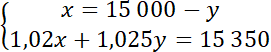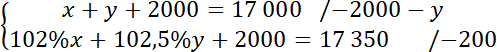 Ustal, jaką kwotę ulokowano na lokacie dwuprocentowej, jeśli pan Tomek podzielił kwotę 17 000 zł na trzy części: 2000 zł odłożył do szuflady, a pozostałe dwie części ulokował na lokatach oprocentowanych odpowiednia 2% i 2,5% w skali roku, dzięki czemu po roku miał do dyspozycji 17 350 zł.
