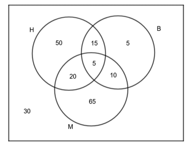 Narysuj w zeszycie diagram przedstawiony obok i go uzupełnij oraz oblicz prawdopodobieństwo tego, że losowo wybrany uczeń nie lubi żadnego z wymienionych przedmiotów, jeśli w ankiecie przeprowadzonej wśród 200 uczniów klas czwartych pewnego liceum otrzymano następujące wyniki: