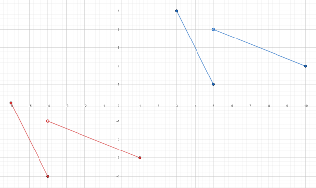 Należy przesunąć punkty wykresu funkcji o 9 jednostek w lewo i 5 jednostek w dół. (Niebieski wykres przed przekształceniami, czerwony wykres po przekształceniach)