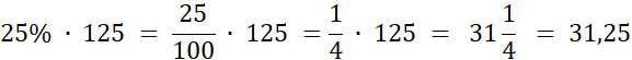 Żeby obliczyć procent z liczby, najpierw zamieniamy procent na ułamek. Procent to ułamek, który w liczniku ma liczbę procent, a w mianowniku liczbę 100. Następnie mnożymy powstały ułamek razy liczbę. 25% z 125 to: