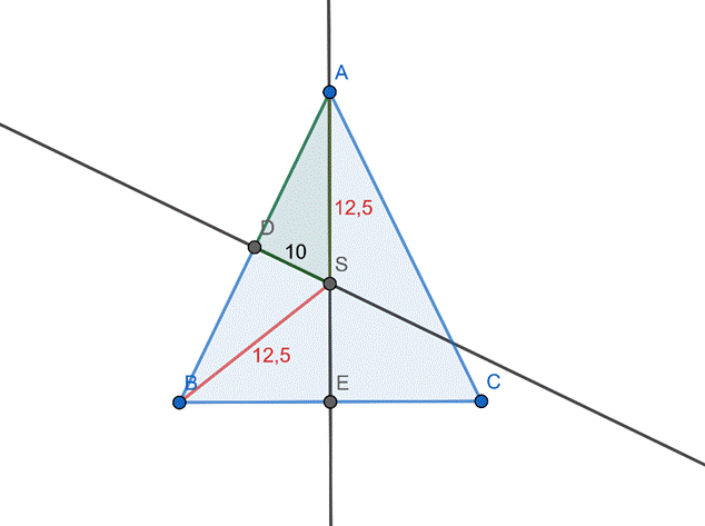 Symetralne boków trójkąta równoramiennego przecinają się w odległości 12,5 cm od wierzchołka przy podstawie i w odległości 10 cm od ramion trójkąta. W tym zadaniu musisz obliczyć długości boków tego trójkąta.