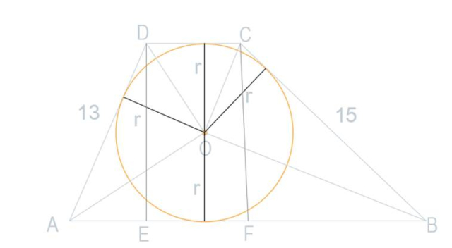 Dany jest trapez o ramionach długości 13 i 15 oraz polu równym 168. Wyznacz pola trójkątów powstałych przez połączenie środka okręgu wpisanego z wierzchołkami trapezu.
