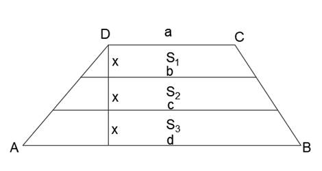 Trapez został podzielony przez odcinki równoległe do podstaw trapezu, tak że wysokość została podzielona na trzy równe części. Wyznacz pole