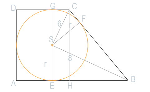Dany jest trapez prostokątny trapez ABCD o podstawach AB i CD. Jakie jest pole tego trapezu, jeśli, został w niego wpisany okrąg o środku w punkcie S i |SC| = 6 oraz |SB| = 8?