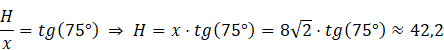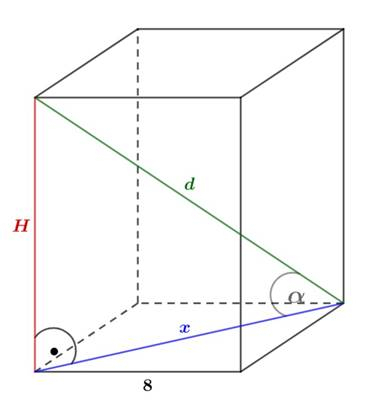 , a wysokość (H) prostopadłościanu oblicz z zależności trygonometrycznych w trójkącie prostokątnym. W kolejnym kroku oblicz pole całkowite (Pc) jako sumę dwóch pól podstaw (Pp) i pola bocznego (Pb).