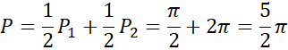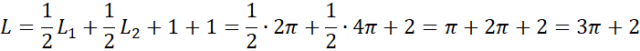Zauważ, że figura składa się z dwóch połówek kół o promieniach 1 i 2. W pierwszej kolejności oblicz pola i obwody pełnych kół o tych promieniach. Skorzystaj ze wzorów