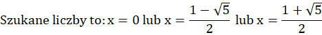 Ułóż równanie szukanej liczby x. Następnie przekształć równanie wyłączając zmienną x przed nawias. Następnie oblicz miejsca zerowe powstałego trójmianu kwadratowego licząc jego deltę. Szukane liczby otrzymujesz z postaci iloczynowej wyrażenia.