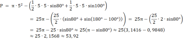 Biała figura może być podzielona na dwa trójkąty równoramienne o bokach długości promienia okręgu i kątach między nimi 80° oraz 100°. Pole niebieskiego obszaru jest równe polu koła bez pól obu tych trójkątów.