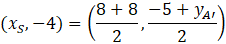 Teraz musisz zapisać ze wzoru współrzędne środka odcinka łączącego punkty A i A’ oraz podstawić znane współrzędne S: