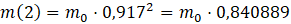 Na podstawie badań izotopu jodu 131I ustalono, że próbka, która początkowo miała masę m0 tego izotopu z powodu rozpadu promieniotwórczego waży m(t) = m0 ∙ 0,917t, gdzie t to ilość dni która upłynęła od określenia masy m0. Twoim zadaniem jest ustalenie o jaki procent ubędzie masy tego izotopu przez okres 2 dni.