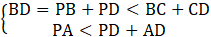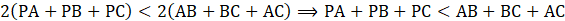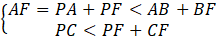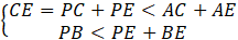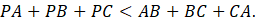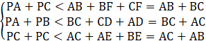 Przedłużamy boki AP do AF, BP do BD, zaś CP do CE. Wypisujemy układ trzech nierówności: