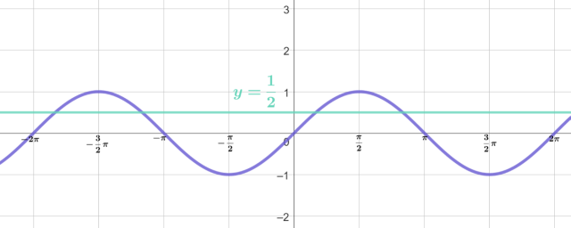 Przedziałów takich jest nieskończenie wiele, a różnica pomiędzy odpowiednimi punktami w kolejnych takich przedziałach wynosi 2π, co wynika z okresowości funkcji sinus. Zatem: