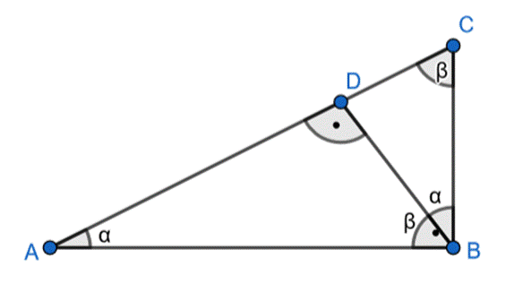 Trójkąty ABD i ABC są podobne z cechy KKK – odpowiadające sobie kąty mają równe miary.