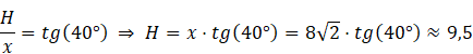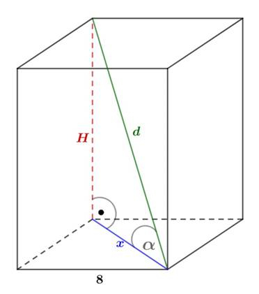 Wyznacz pole powierzchni całkowitej prostopadłościanu o podstawie kwadratu o wymiarach przedstawionych na rysunku, wiedząc, że kąt nachylenia przekątnej graniastosłupa do powierzchni podstawy wynosi α. Wynik podaj z dokładnością do części dziesiętnych.