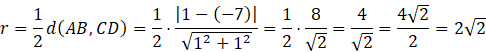 Promień okręgu, czyli połowa odległości pomiędzy tymi prostymi wynosi: