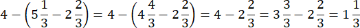 W tym zadaniu musisz odjąć od siebie dwa ułamki. Na początku musisz wykonać działania w nawiasach i zapisać liczby mieszane, zwiększając ułamek przy jednoczesnym obniżeniu wartości liczby całkowitej. Następnie musisz odjąć od siebie dwie wartości — jeśli mają one takie same mianowniki, wówczas odejmuje się od siebie liczniku obydwu wyrażeń, w przypadku gdy odejmujemy od siebie liczby mieszane, wtedy odejmujemy od siebie liczby całkowite oraz ułamki (również od siebie).